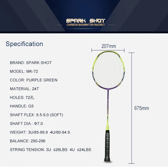 7.0 मिमी शाफ्ट कार्बन बैडमिंटन रैकेट MK72 पूर्ण कार्बन सामग्री द्वारा बनाया गया है। 7.0 मिमी शाफ्ट व्यास के साथ। यह पेशेवर खिलाड़ी के लिए है।